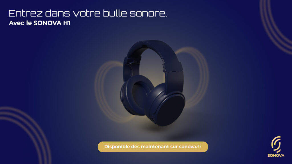 L’idée centrale était de traduire visuellement l’expérience sonore — pas le produit, mais ce qu’il procure. D’où le slogan « Entrez dans votre bulle sonore » : une promesse d’immersion et d’isolation. J’ai construit toute la direction artistique autour de cette idée : un fond marine profond qui évoque l’obscurité totale quand on met un casque, des ondes sonores dorées qui rayonnent depuis le produit, et un casque en lévitation pour symboliser la légèreté de l’expérience.